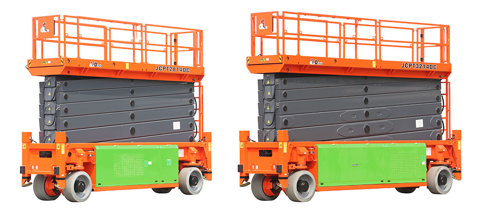 The maximum load of the two large electric scissors is 600kg, they are self-propelled and can meet the needs of multiple people working at the same time. They are equipped with a 1.9m extension platform, and the working platform size of JCPT3214DC can reach 5.85m*1.2m. Also, they are both equipped with 4X4 drive mode, which can realize crab-turn and flexible operation.