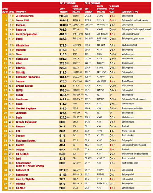 Dingli 6th , SDLG 17th , XCMG 18th ,Sinoboom 19th , Zoomlion 22nd , Runshare 35th , Mantall 37th