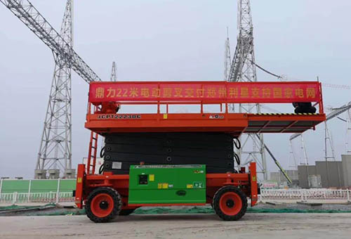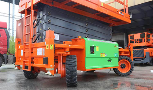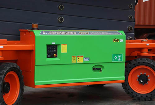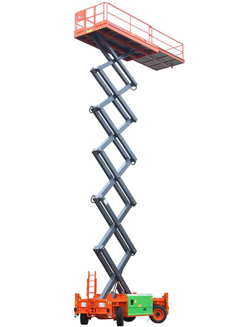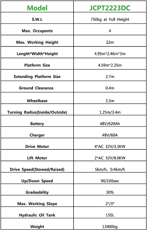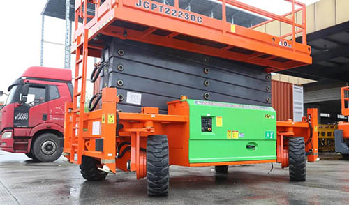 JCPT2223DC, does not change any parts, continues all characteristics of large rough-terrain scissor lift JCPT2223RTB, safe working load is 750kg, and the max. working height is 22 meters, with multiple people working at the same time.