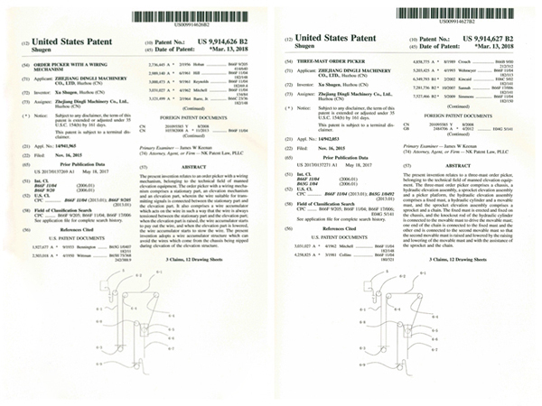 The two patents for inventions are Order-picker With a Wiring Mechanism and Three-mast Order Picker, which have been duly authorized through the two-year narrow examination by the United States Patent and Trademark Office and several rounds of international expert defenses, and after the confirmation of its international initiative, advancement and uniqueness.